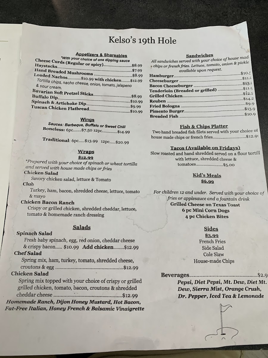 Kelso's 19th Hole offers a well-rounded menu that caters to a variety of tastes, whether you're in the mood for a savory pizza, a classic sandwich, or a light salad. Each dish brings something unique to the table, ensuring that there's something for everyone to enjoy.